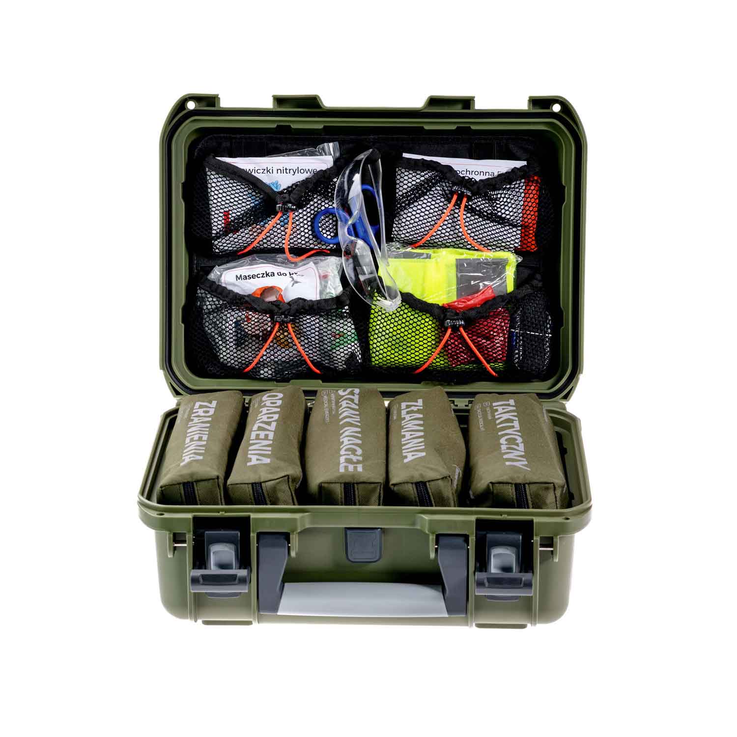 TRAUMA KIT Apteczka Modułowa AROSZT - Taktyczna - Walizka 6 (zielony) to zestaw składający się z 6 wyselekcjonowanych modułów: ochrona osobista, zranienia, oparzenia, stany nagłe, złamania oraz taktyczny. Moduły umieszczone zostały w wodoszczelnej walizce.